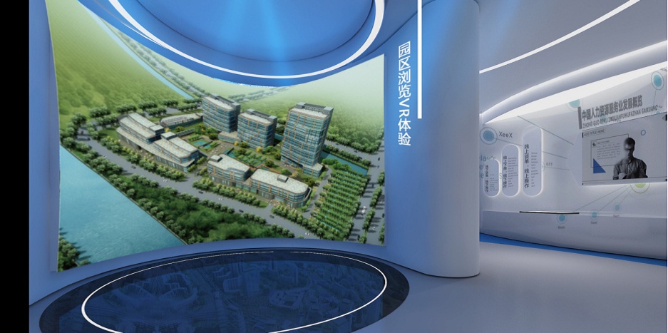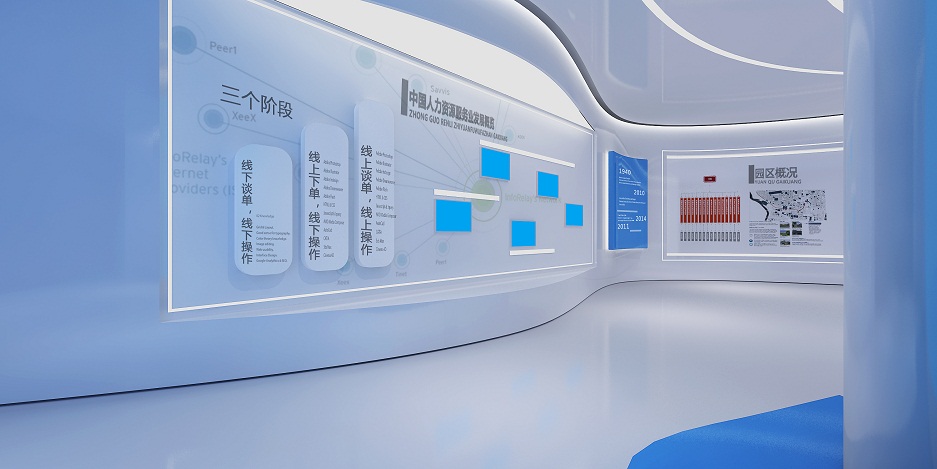 根據(jù)人力資源服務(wù)產(chǎn)業(yè)園的特點(diǎn),結(jié)合了江南元素水的特征,展示廳以流暢線型的造型風(fēng)格,科技手法的運(yùn)用,藍(lán)色,數(shù)字化,